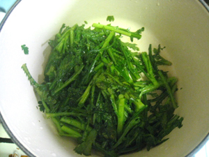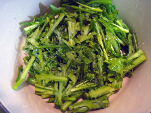 - 春菊は良く洗い、ざくざくと4等分に切る。葉の部分はとっておき、茎の部分は鍋に入れ、塩少々(分量外)を振って、弱火で蒸し煮にする。