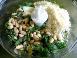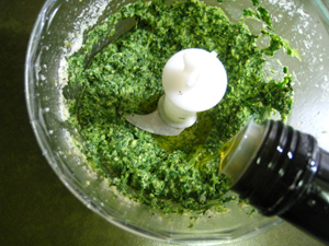- 葉の部分、2の茎の部分、松の実、パルメジャーノ、ニンニク、塩を入れて、フードプロセッサーに掛ける。
