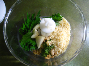 - 大ざっばにちぎった大葉、ニンニク、松の実、パルメジャーノをフードプロセッサーに掛ける。