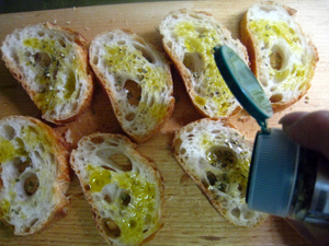 1. バゲットは1cm程度にスライスし、オリーブオイルを薄く塗り、軽くドライハーブを振る。