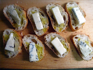 2. 薄くカットしたゴルゴンゾーラを1に乗せ、オーブントースターで3分ほど、こんがりとトーストする。